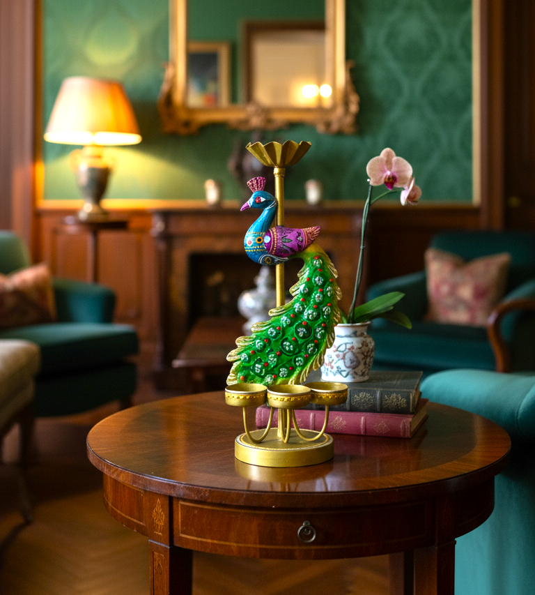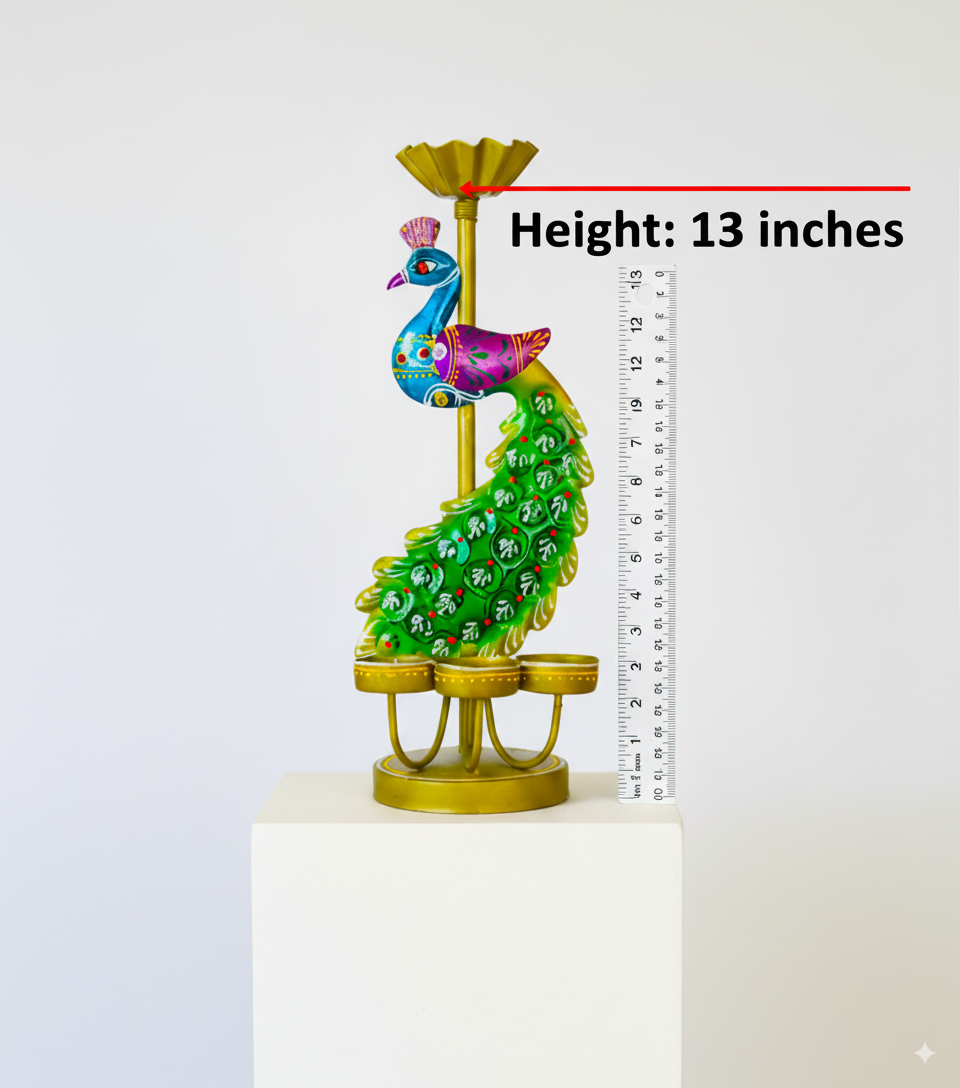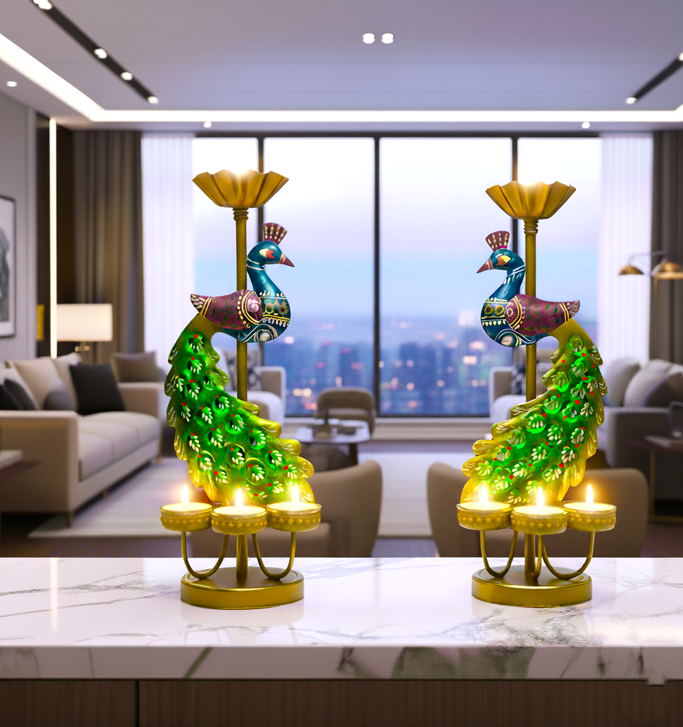 Each holder features an intricately painted peacock with a striking green tail and golden base, symbolizing prosperity and good fortune. Perfect for Diwali, Navratri, weddings, or daily home décor, these tealight holders create a soothing ambience with their warm glow.